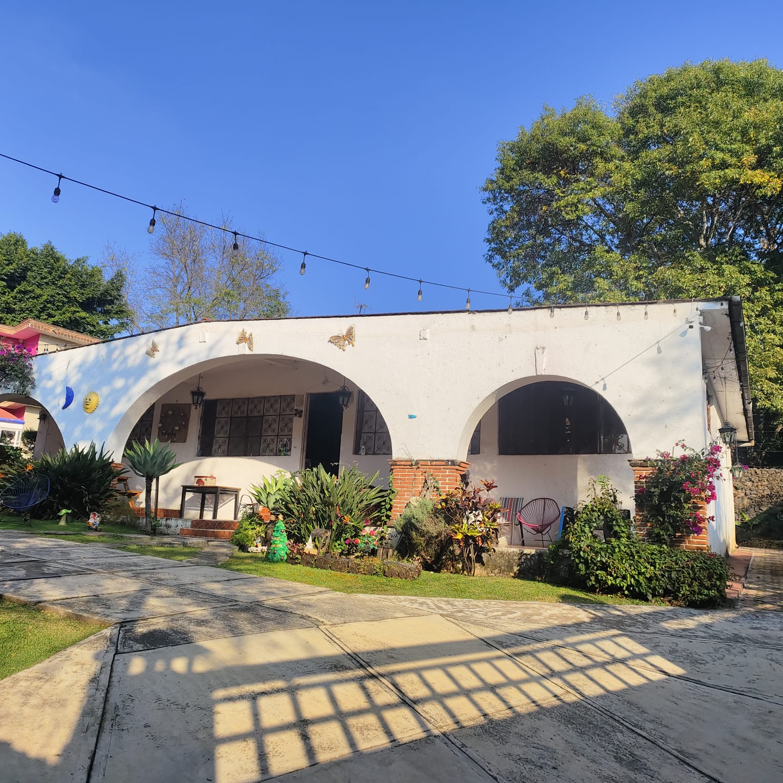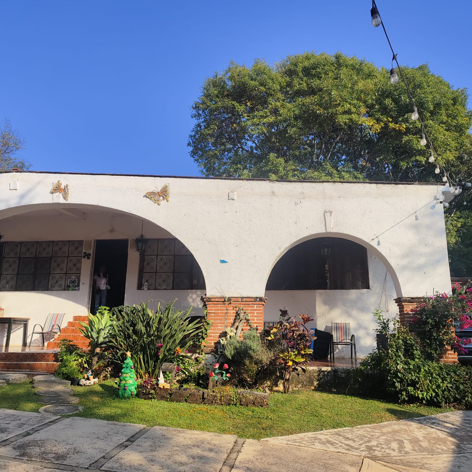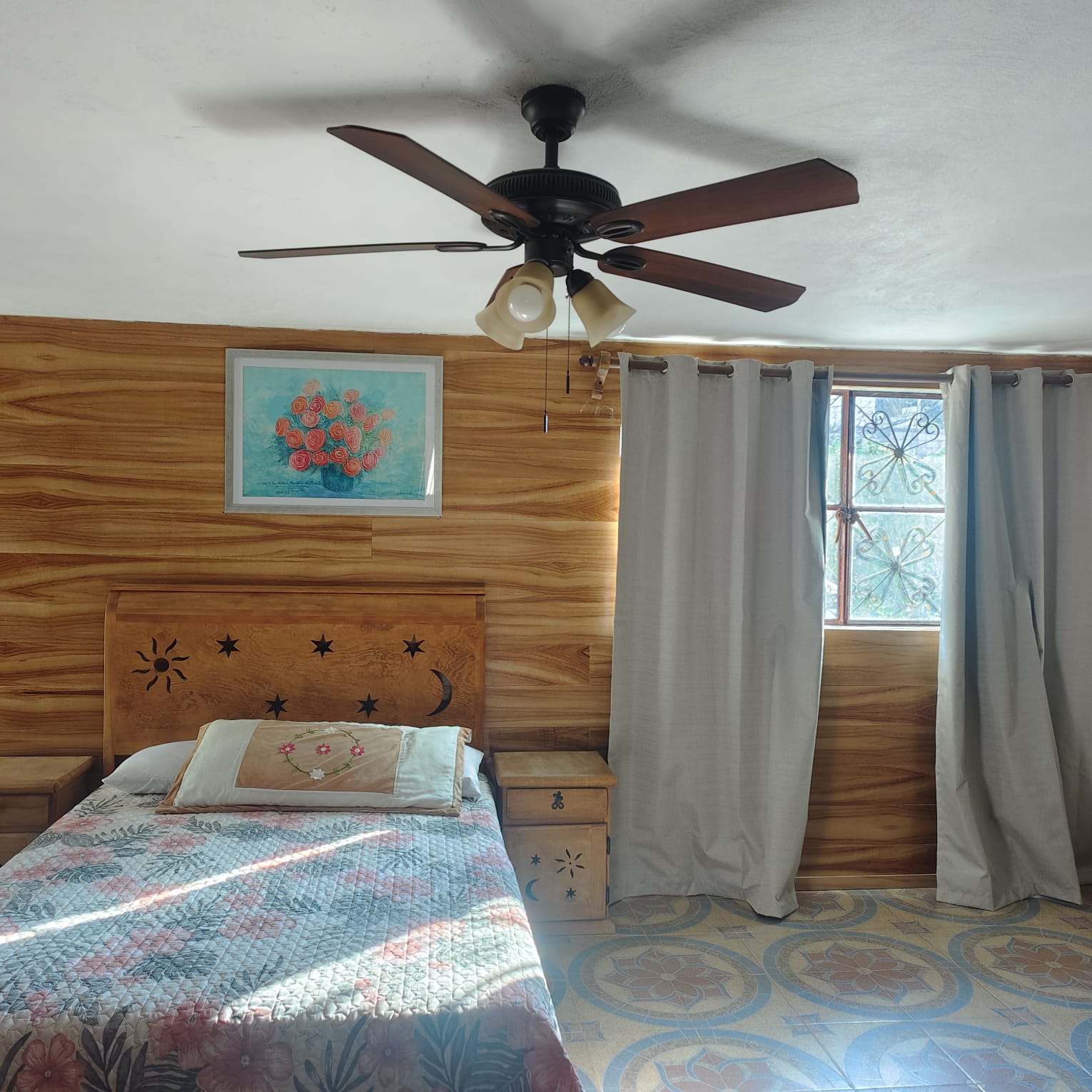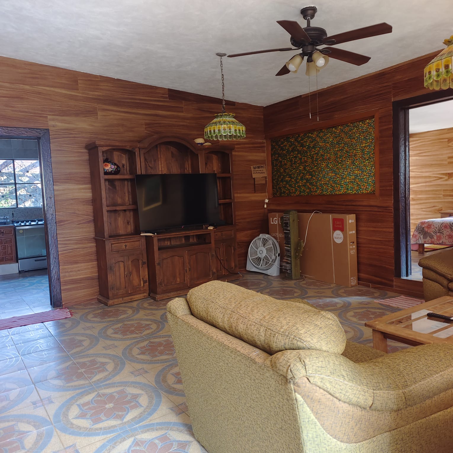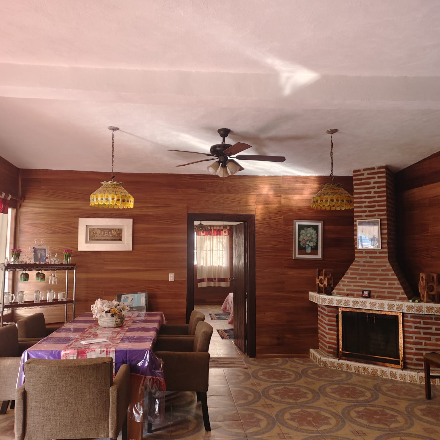 Casa principal con 3 habitaciones y 2 baños, cocina, sala, comedor con chimenea.