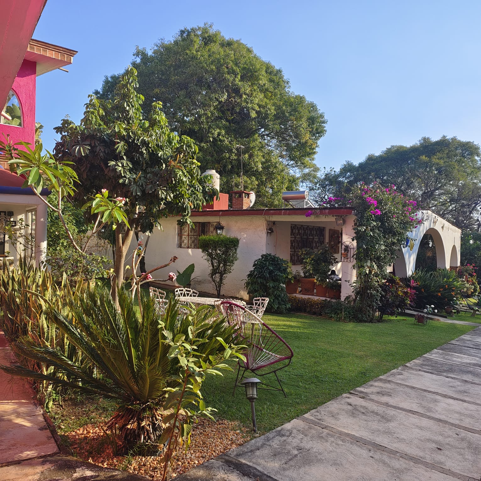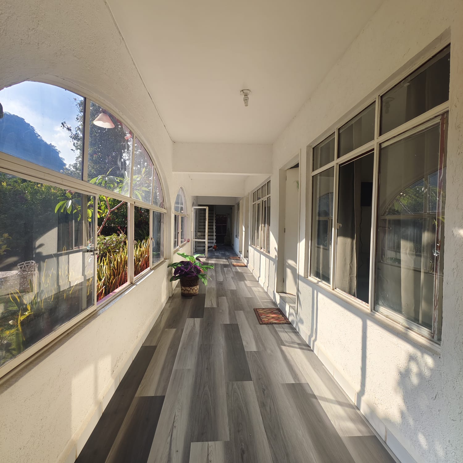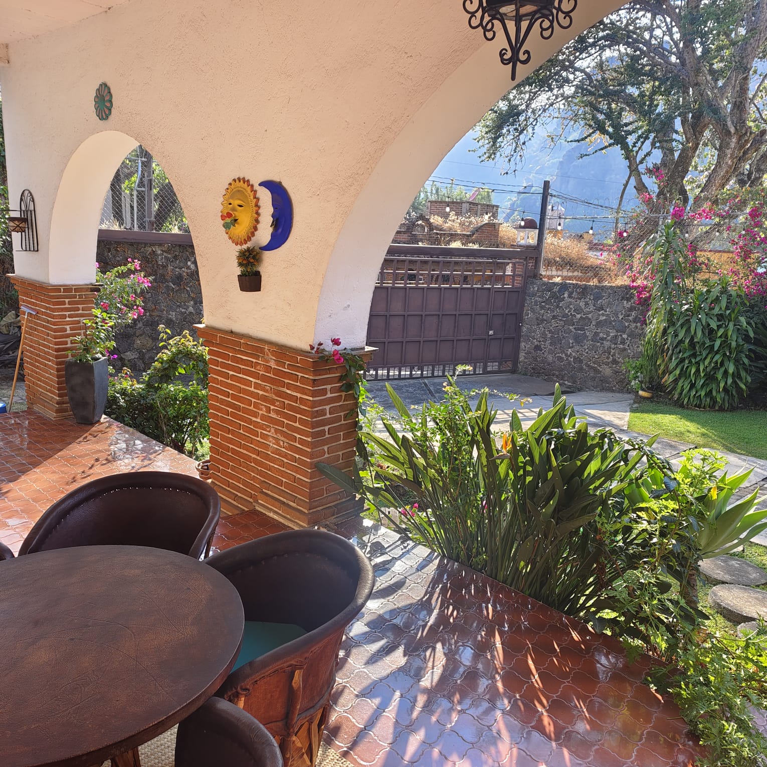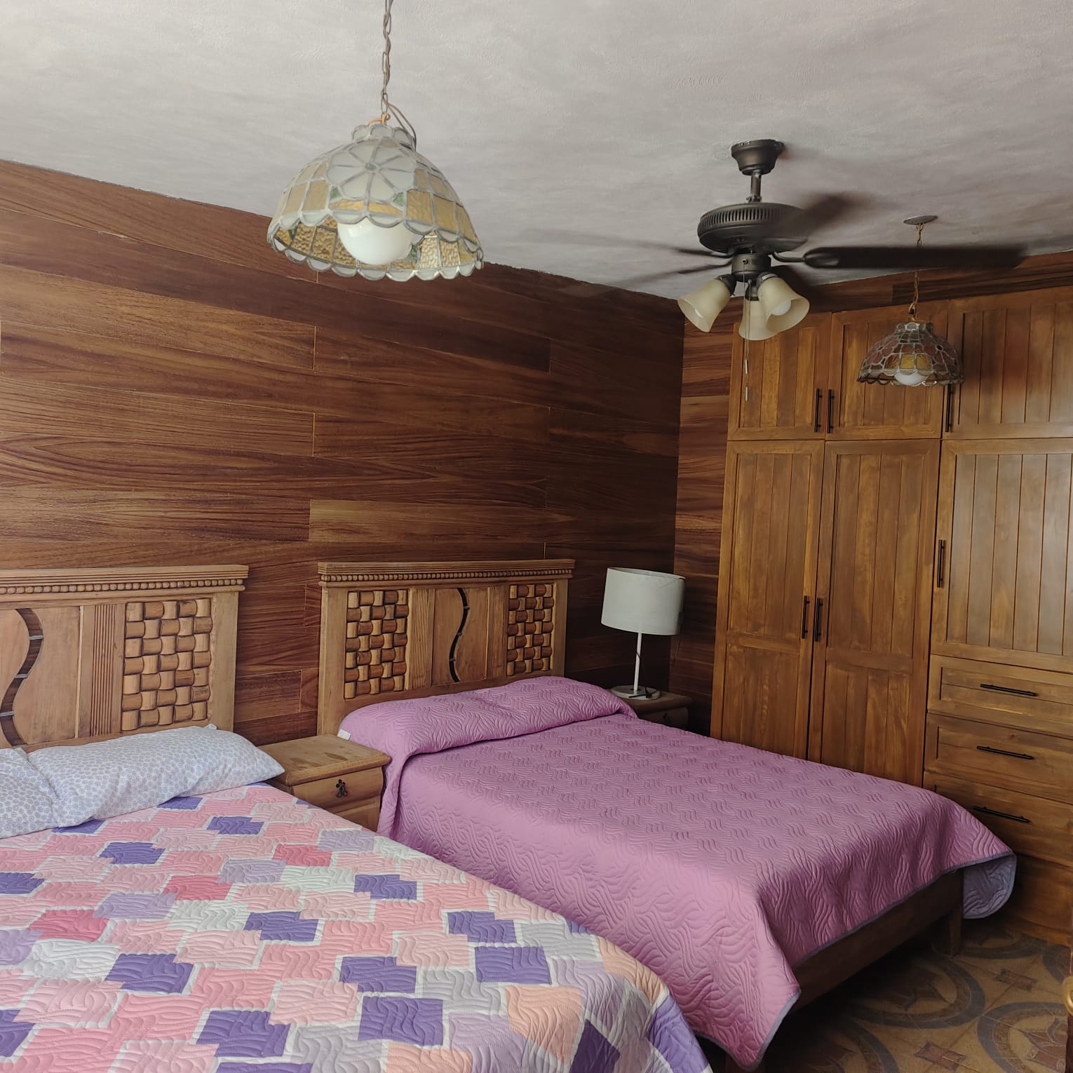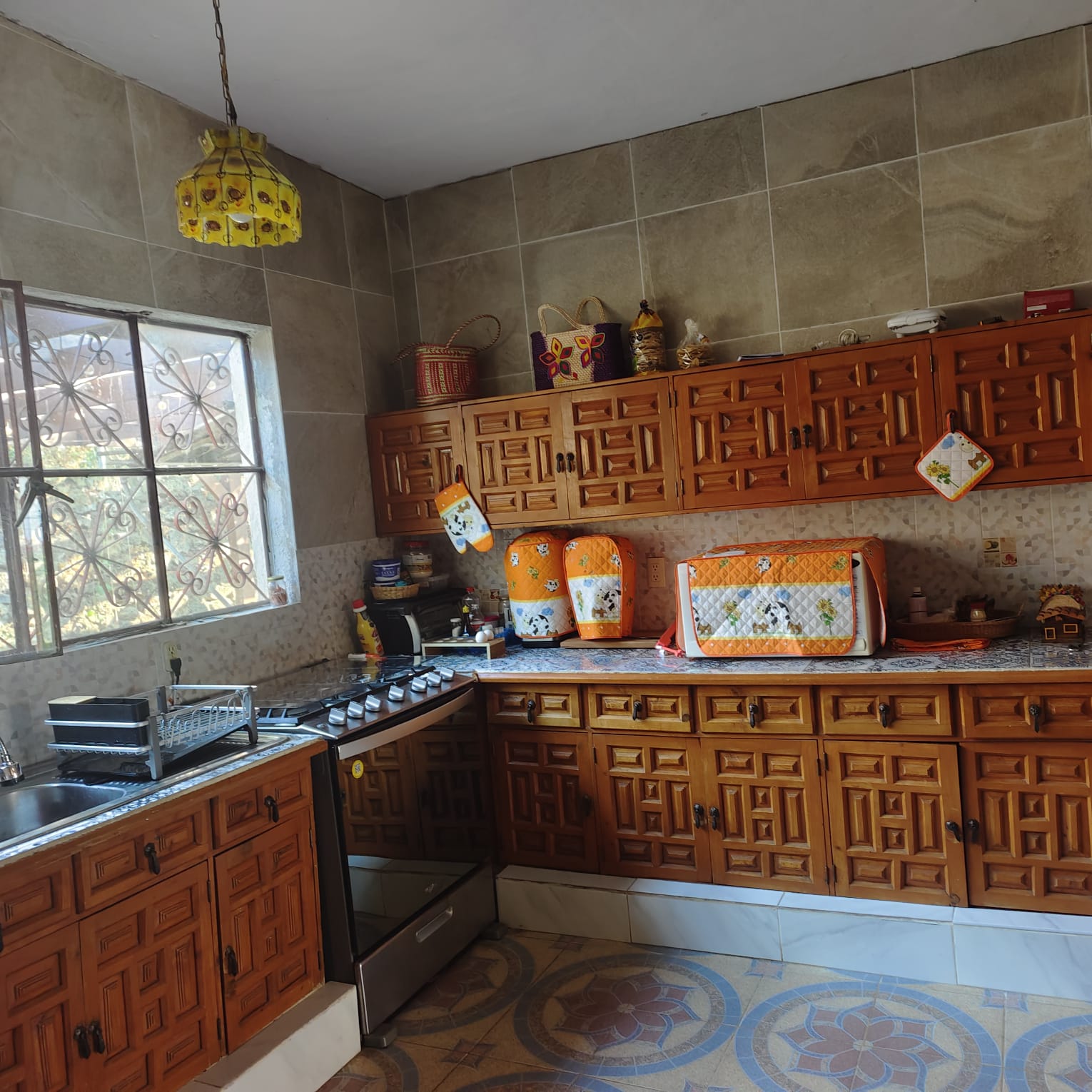 Casa principal con 3 habitaciones y 2 baños, cocina, sala, comedor con chimenea.