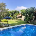 Alberca, camastros, pérgola y hermoso jardín plano.