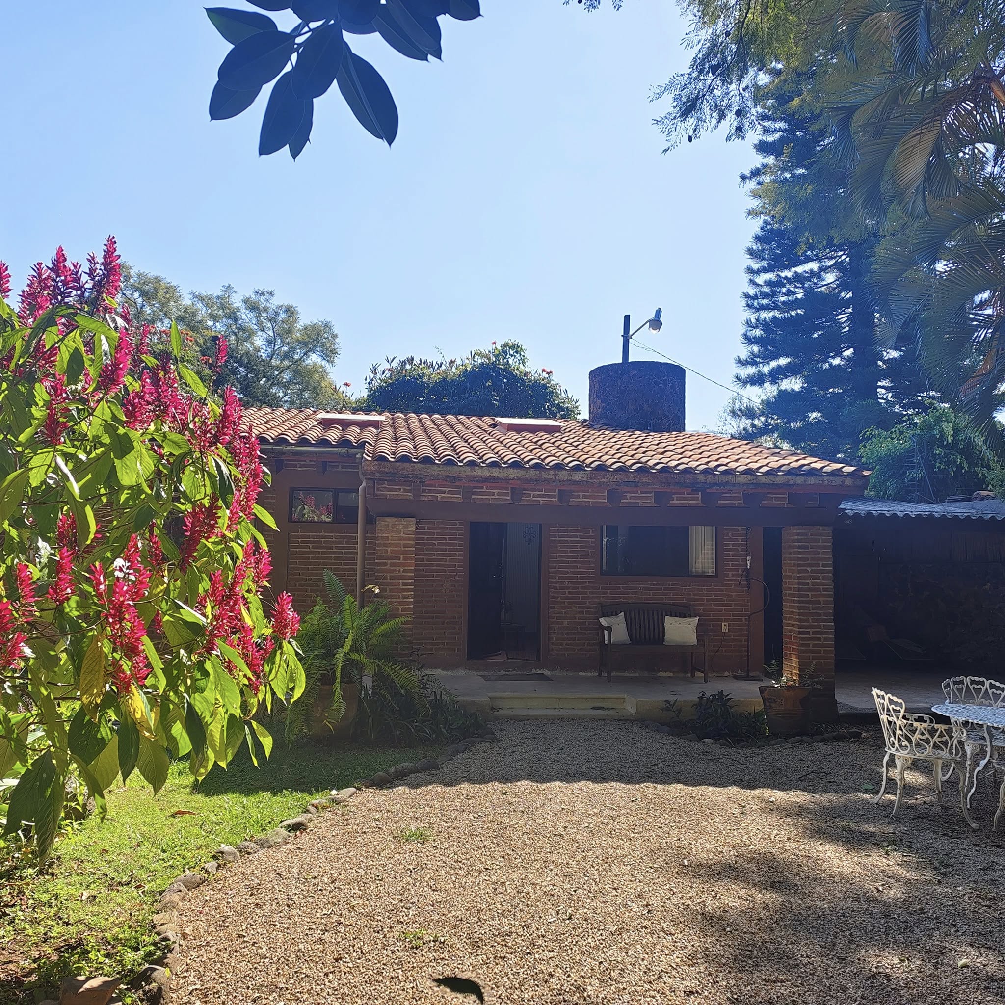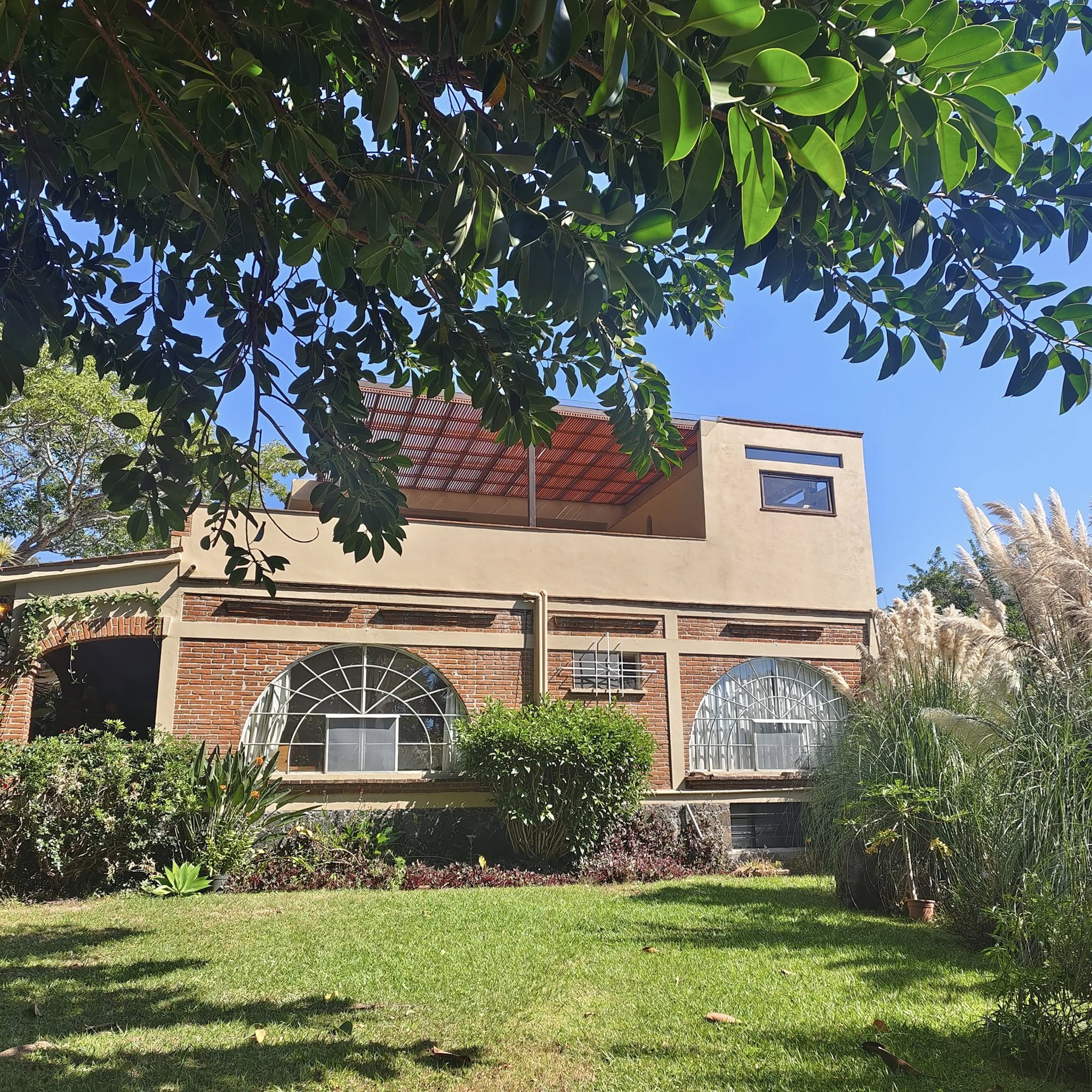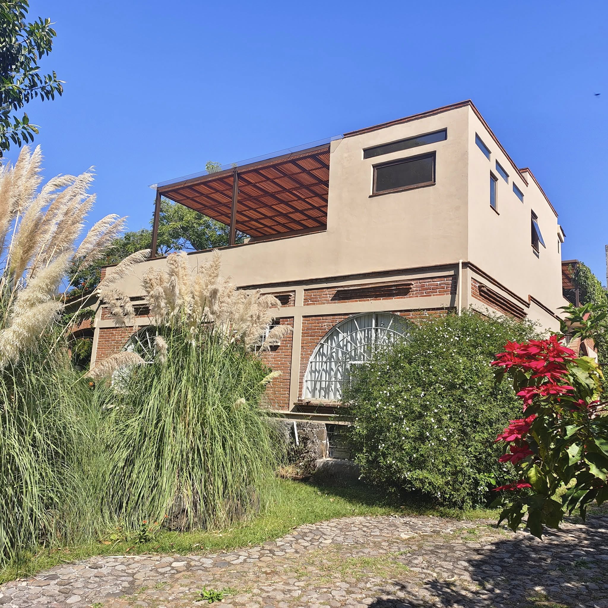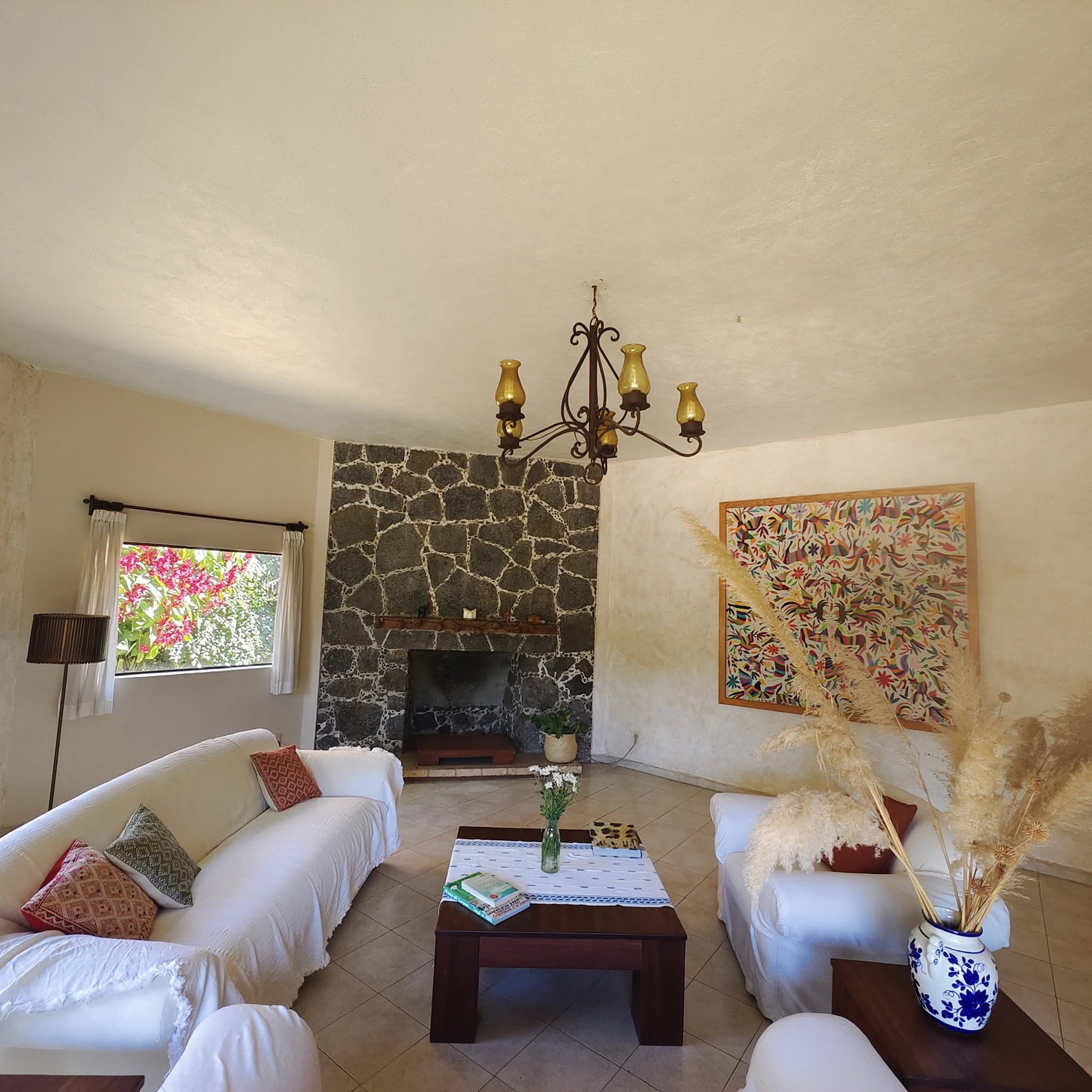Casa principal con 3 amplías recámaras cada una con baño completo y vestidor, 1 estudio con cama Queen abatible, cocina equipada con isla de piedra de granito, comedor con mesa para 10 a 12 personas , cuarto de lavado y 3 amplías terrazas (1 en planta baja y 2 en planta alta) con hermosa vista a las montañas de Tepoztlán.