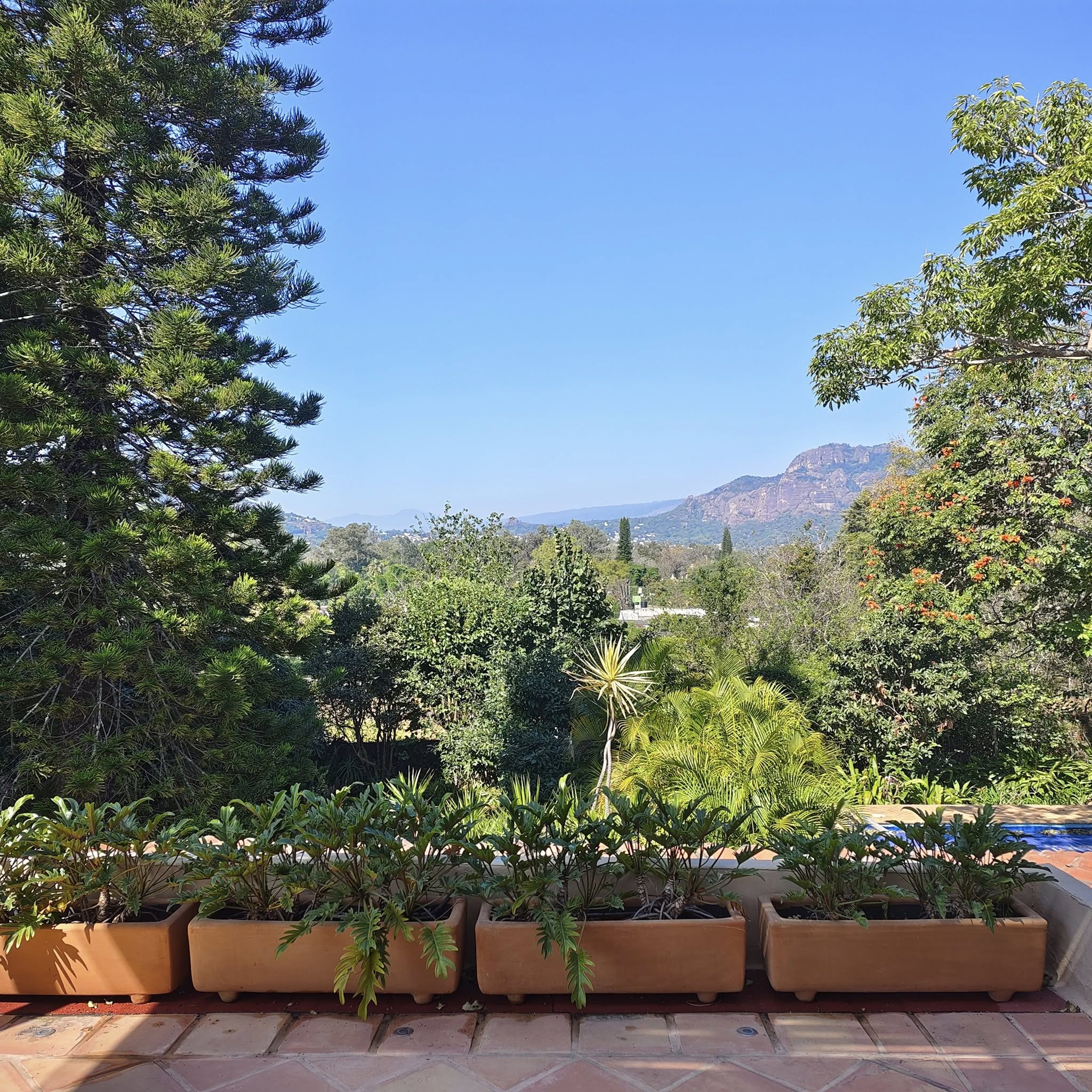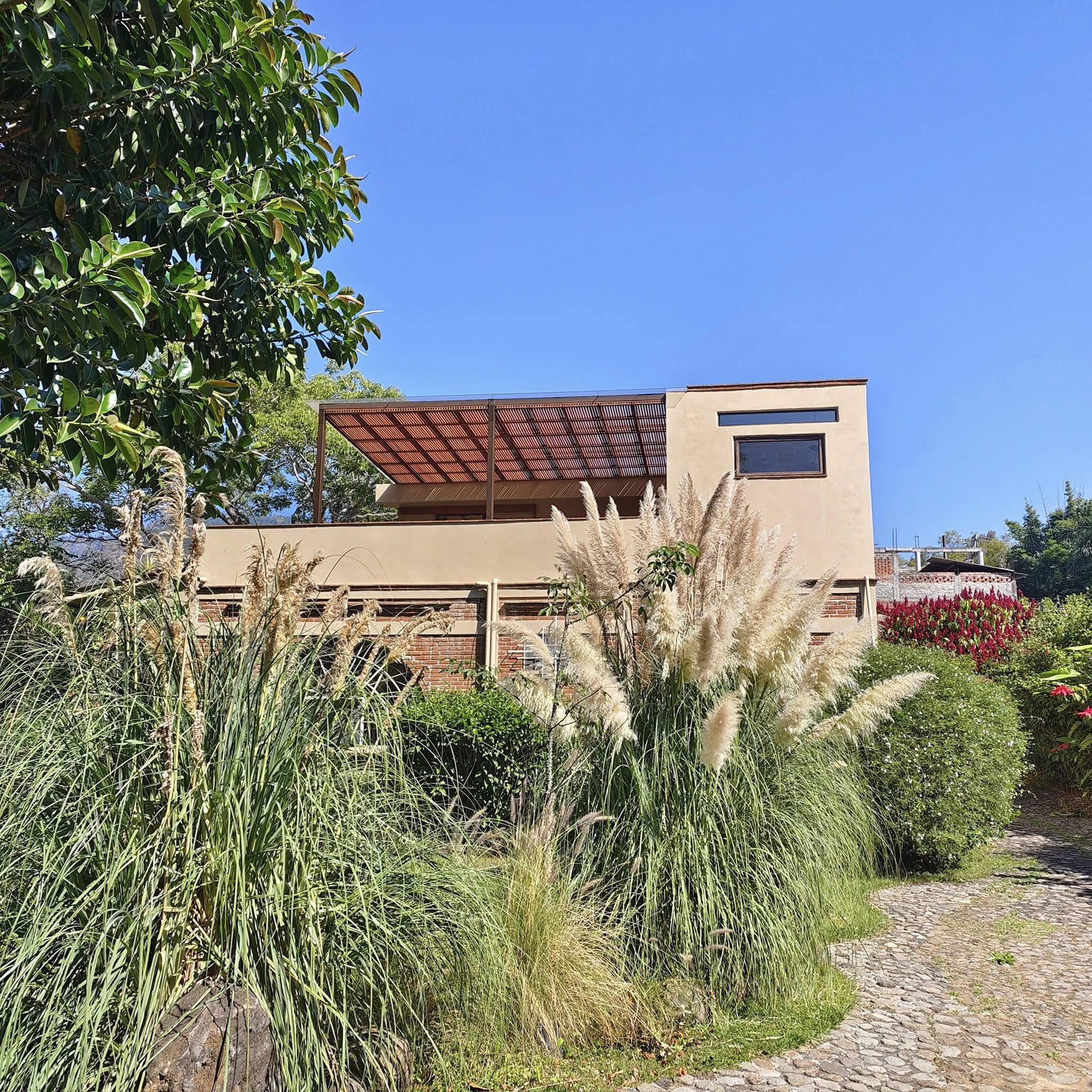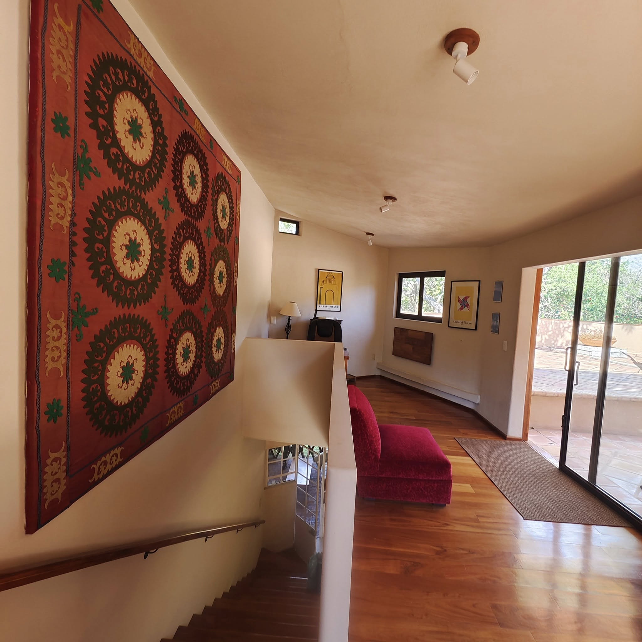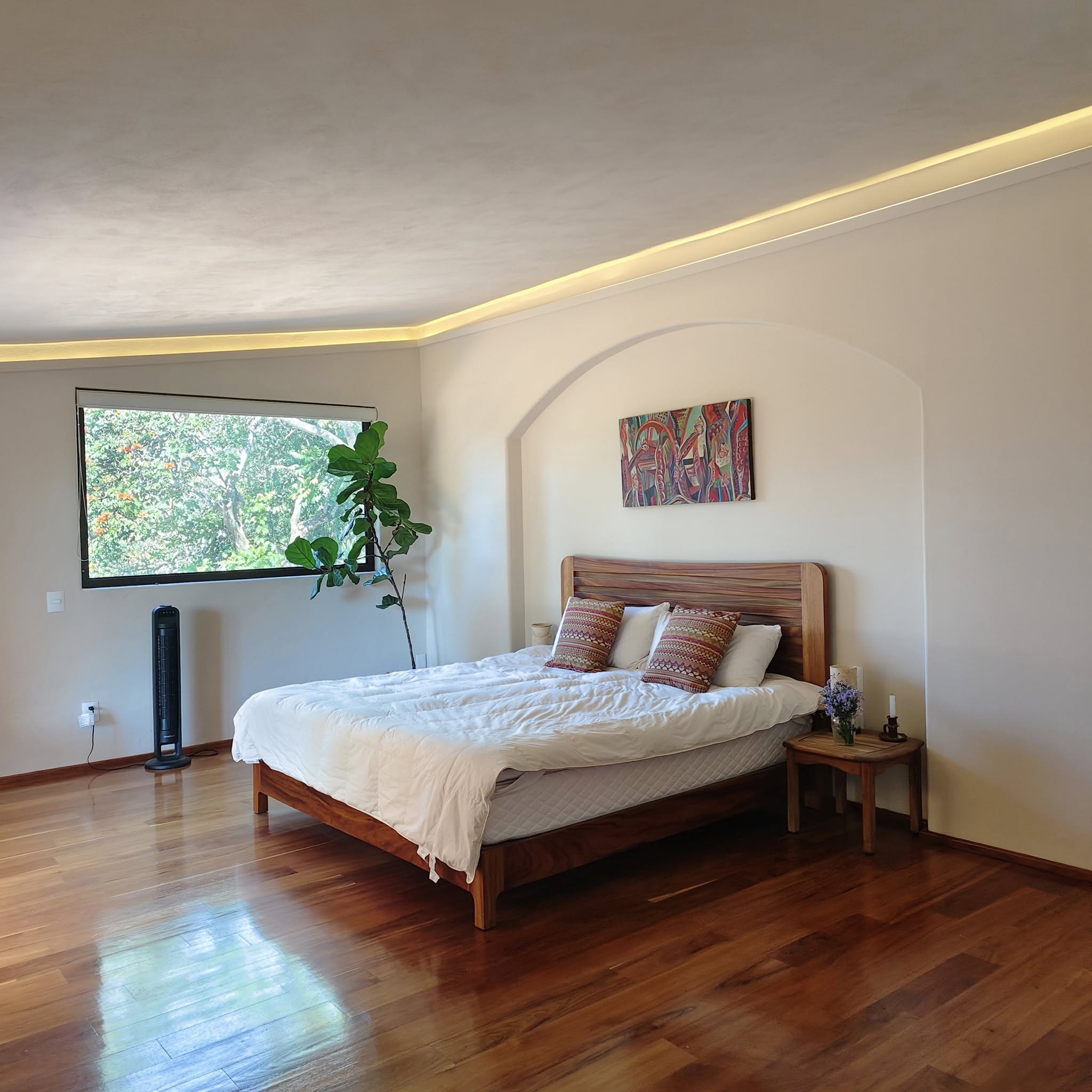 Casa principal con 3 amplías recámaras cada una con baño completo y vestidor, 1 estudio con cama Queen abatible, cocina equipada con isla de piedra de granito, comedor con mesa para 10 a 12 personas , cuarto de lavado y 3 amplías terrazas (1 en planta baja y 2 en planta alta) con hermosa vista a las montañas de Tepoztlán.
