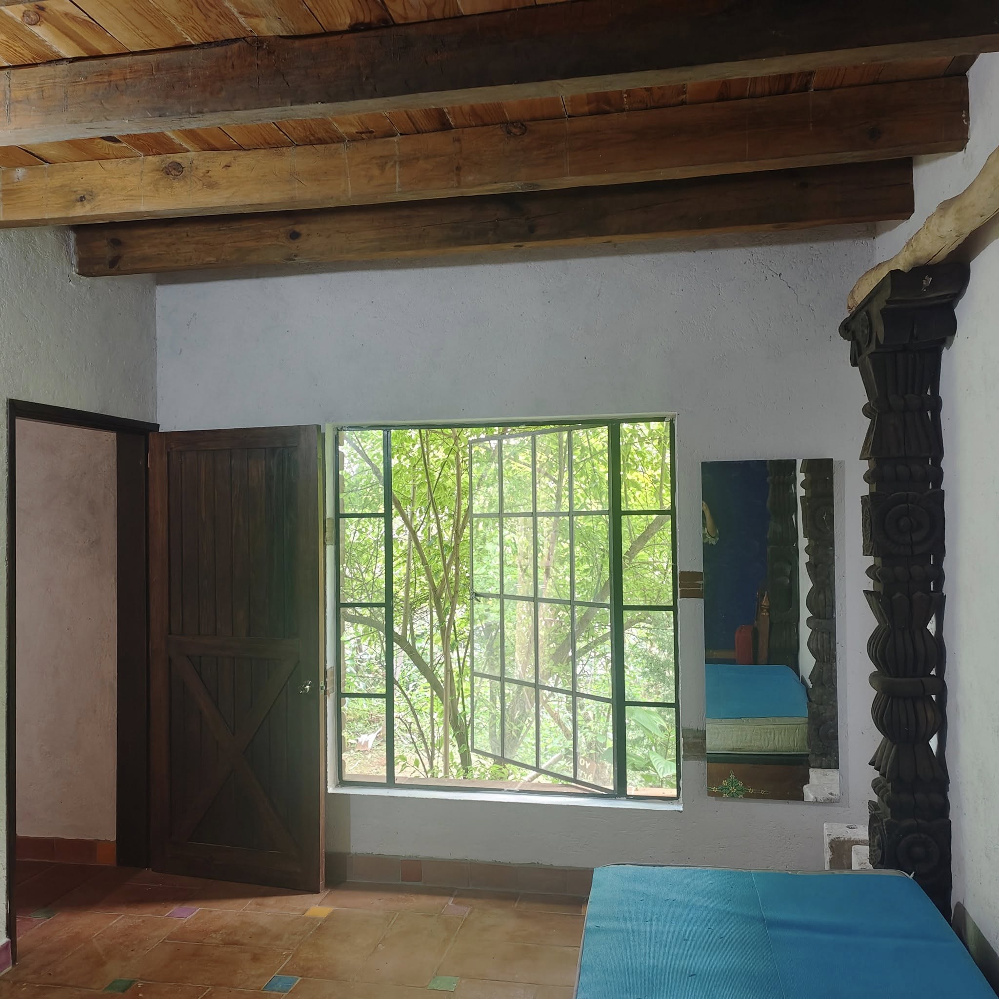*1 recámara con techo de madera rústica y ventana con vista al jardín trasero, espacio para clóset.