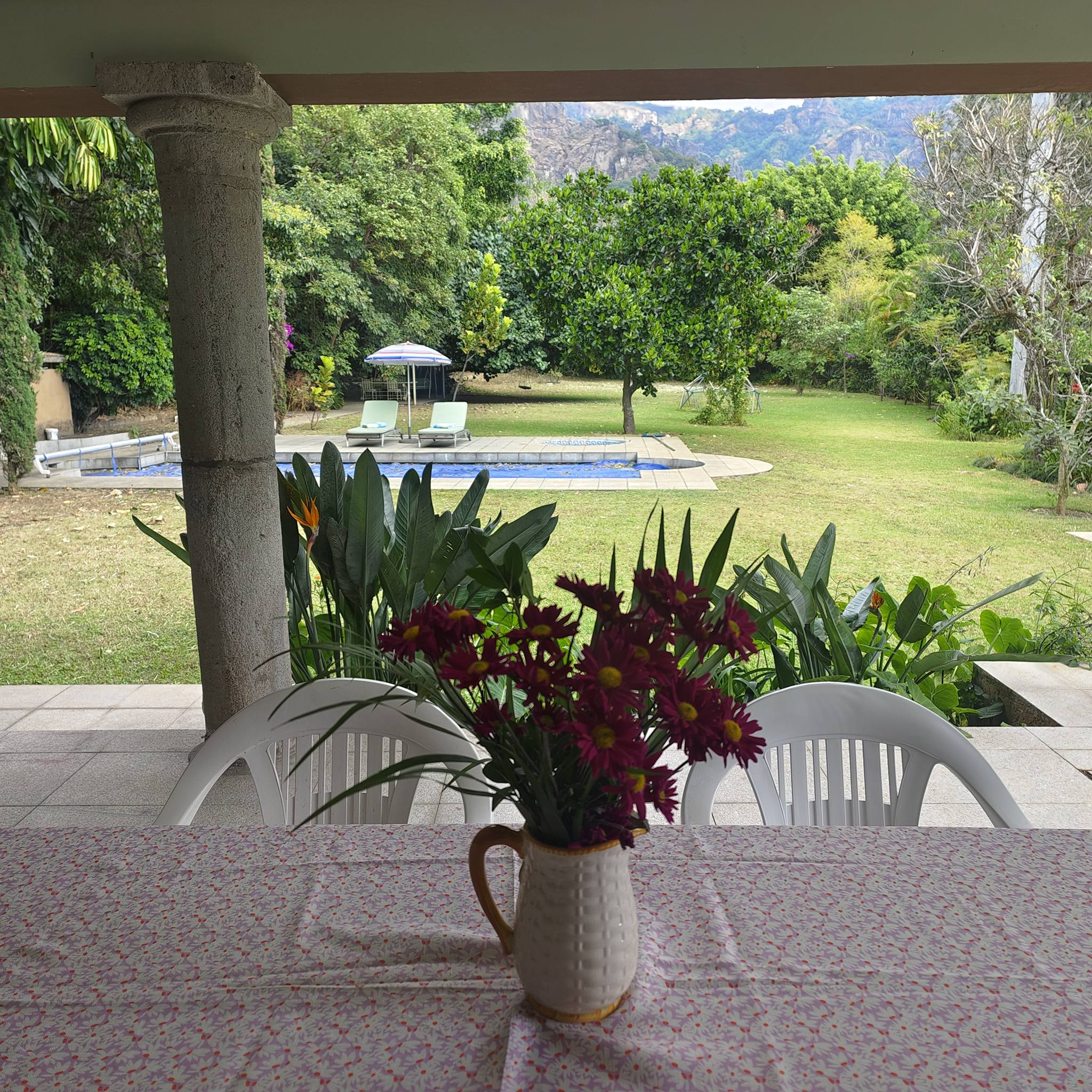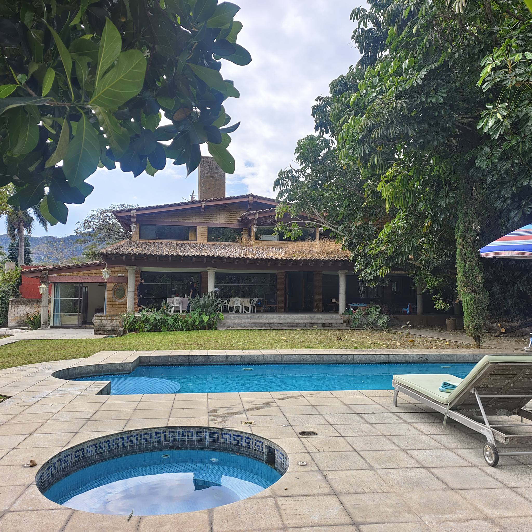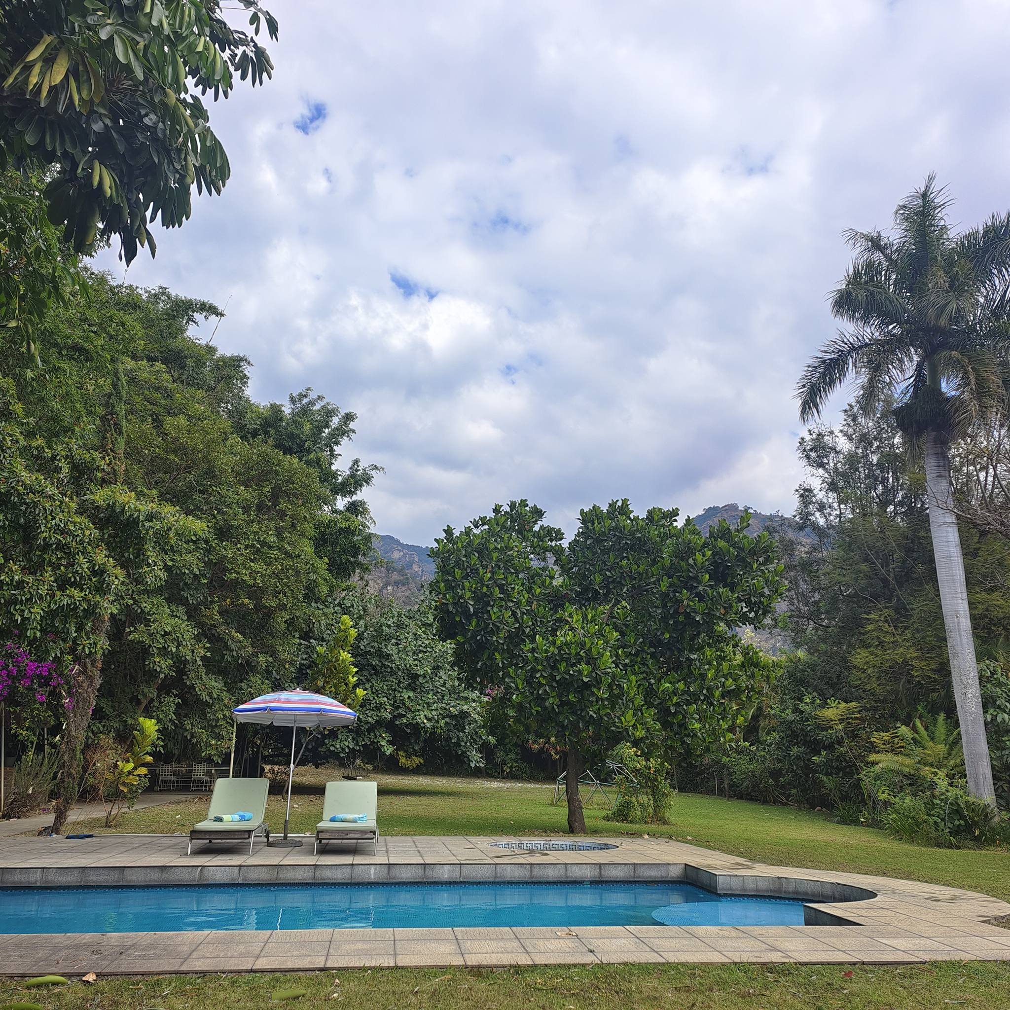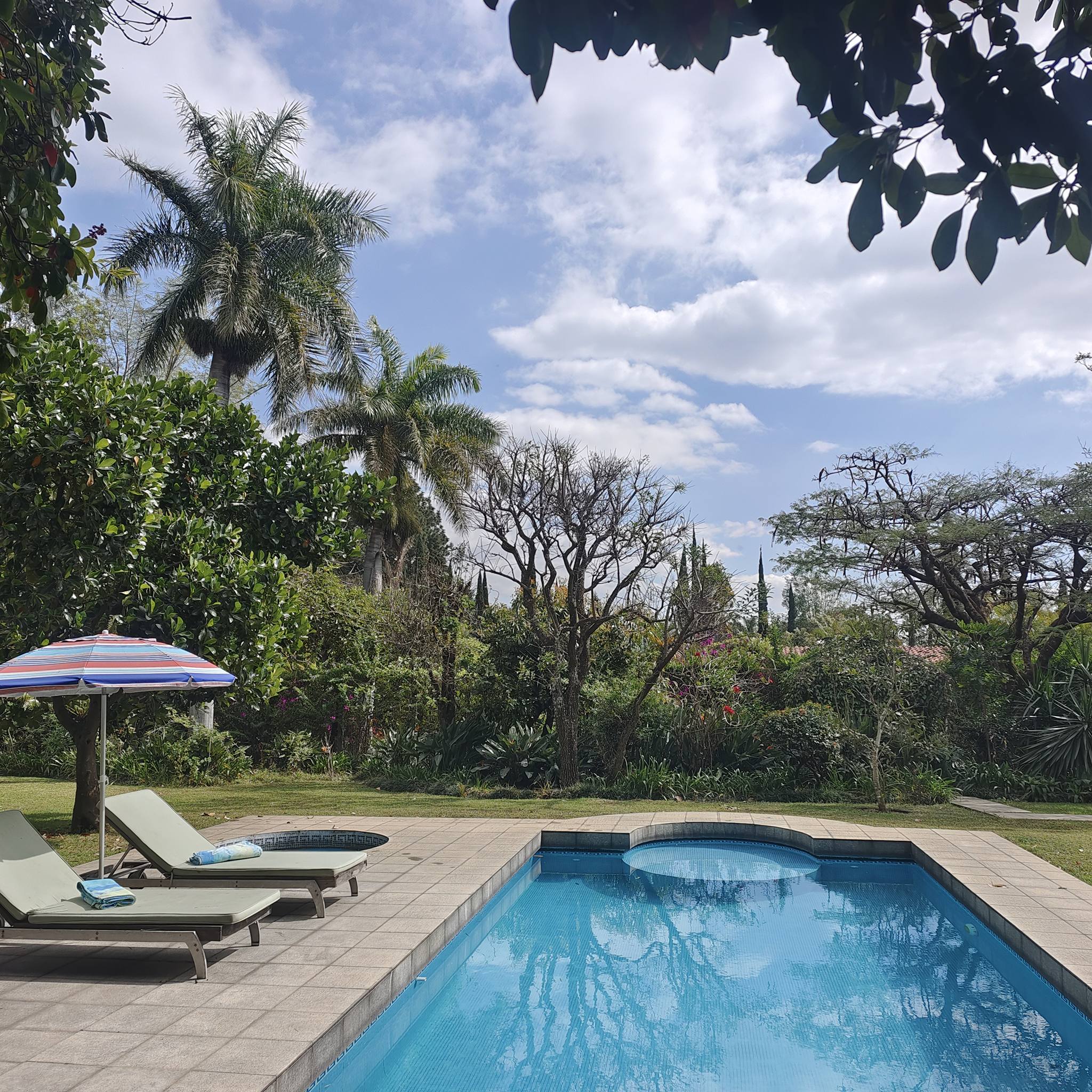 Jardín plano con alberca (sistema solar), jacuzzi, 2 camastros y asador.