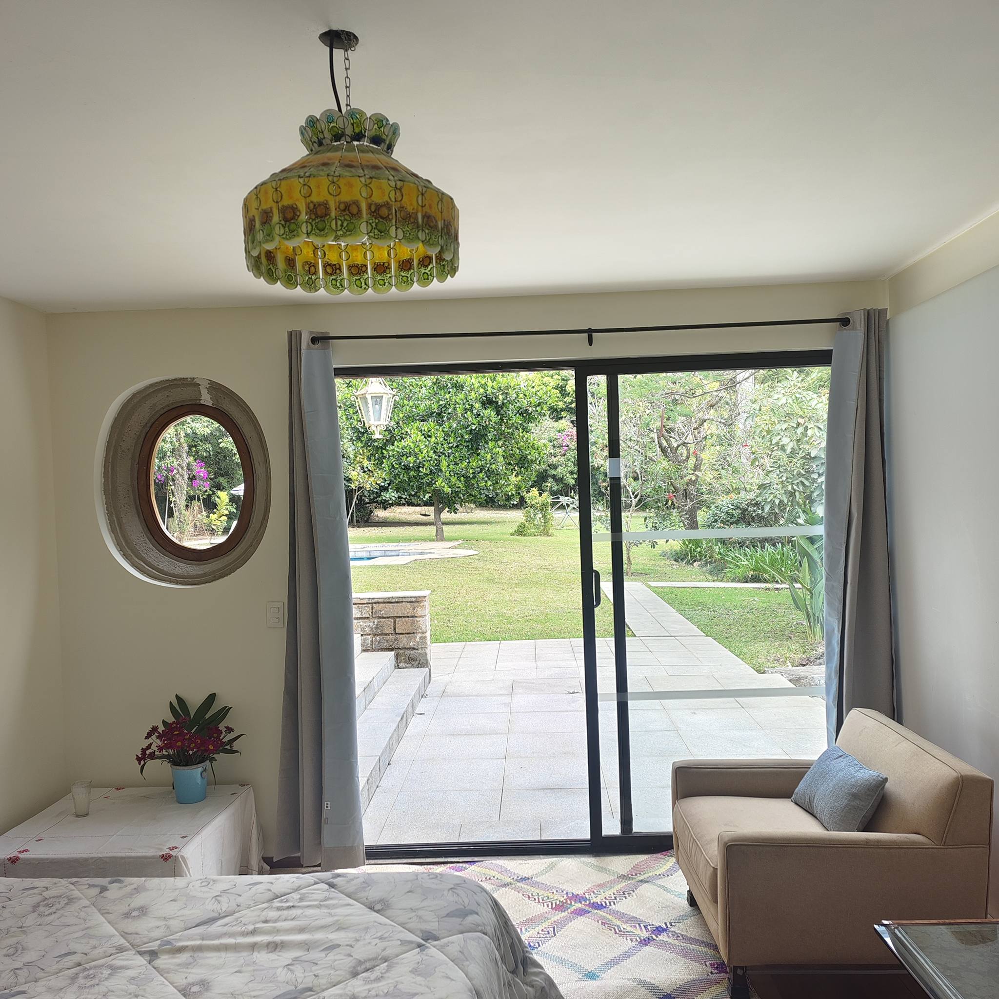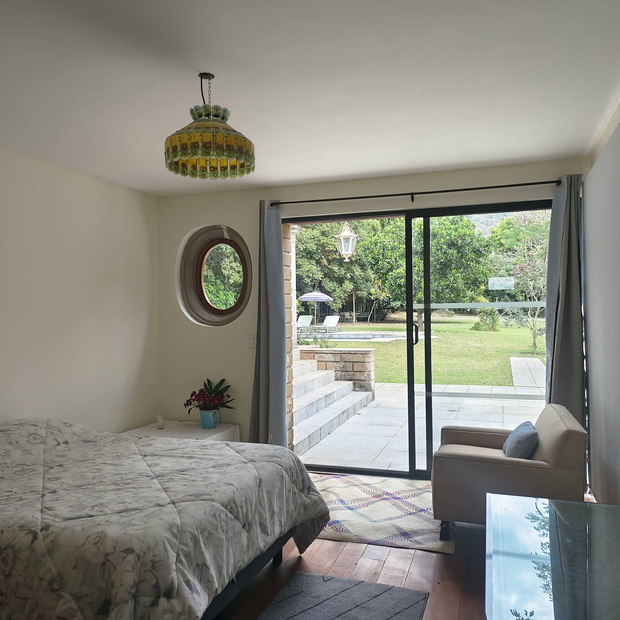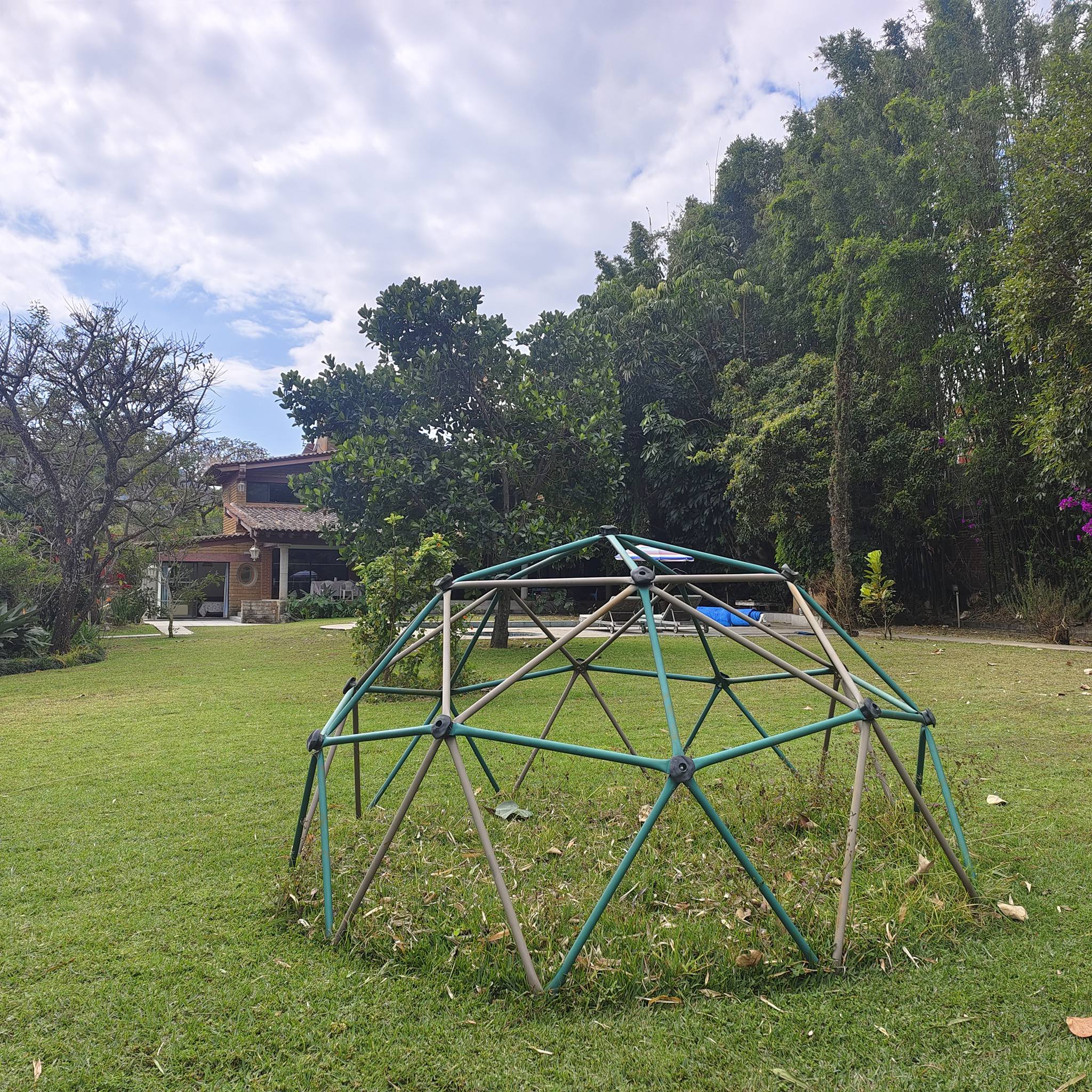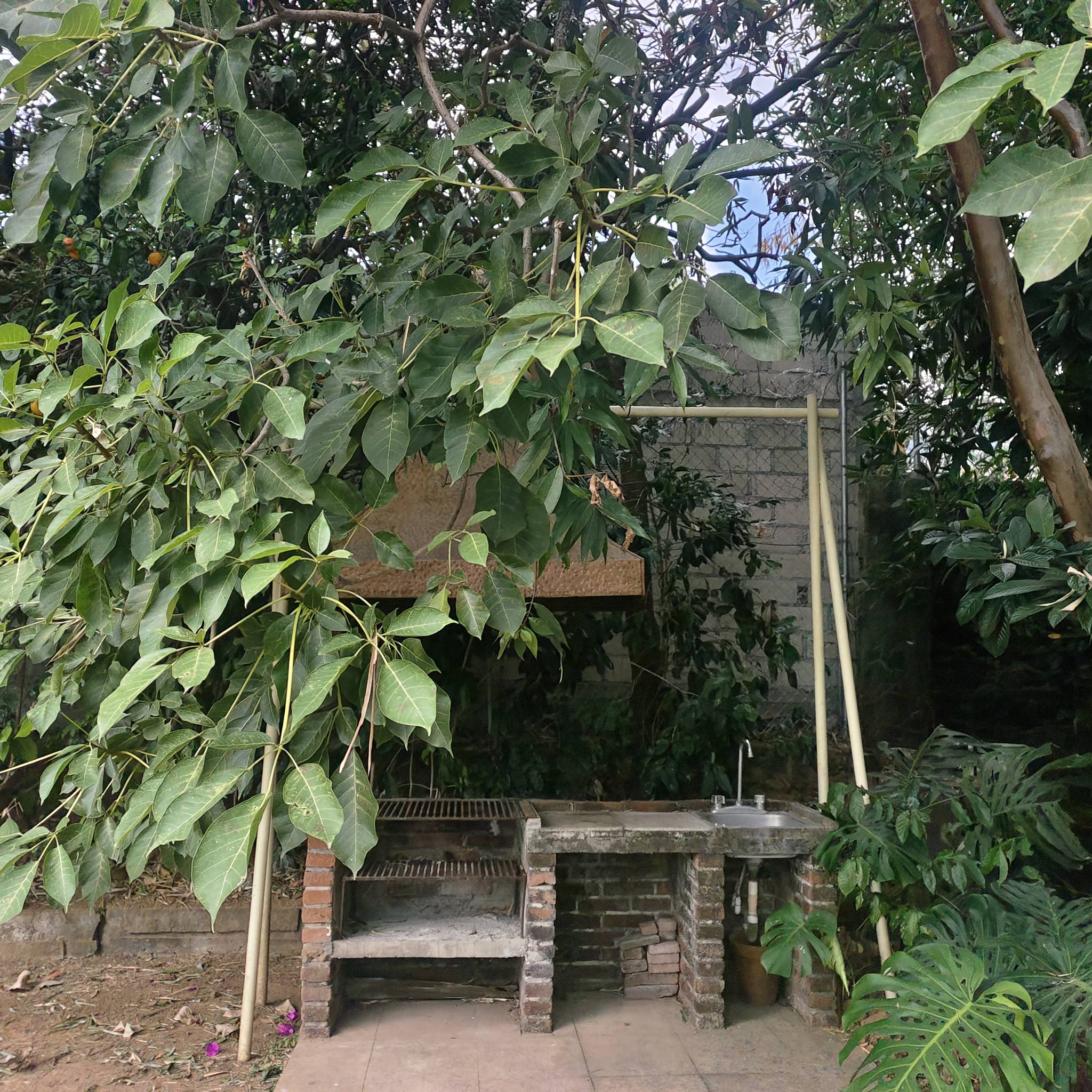 Jardín plano con alberca (sistema solar), jacuzzi, 2 camastros y asador.