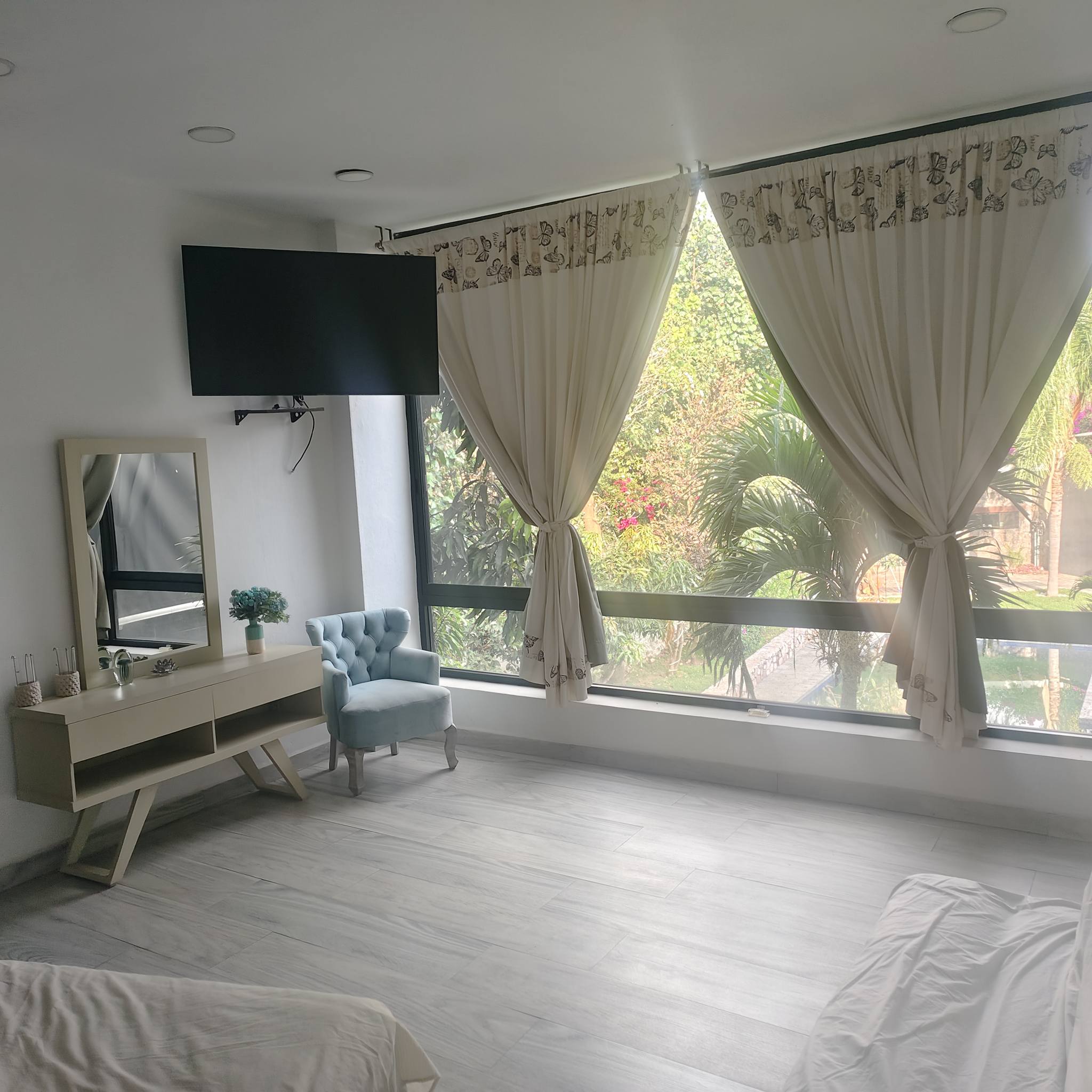 Totalmente amueblada, cuenta con 3 recámaras amplias con baño completo cada una (dos cuentan con aire acondicionado, recámara de planta baja con salida directa al jardín), sala con aire acondicionado, con techos altos, comedor, cocina con barra desayunador y medio baño. Jacuzzi en terraza techada en planta alta con sistema solar y caldera.