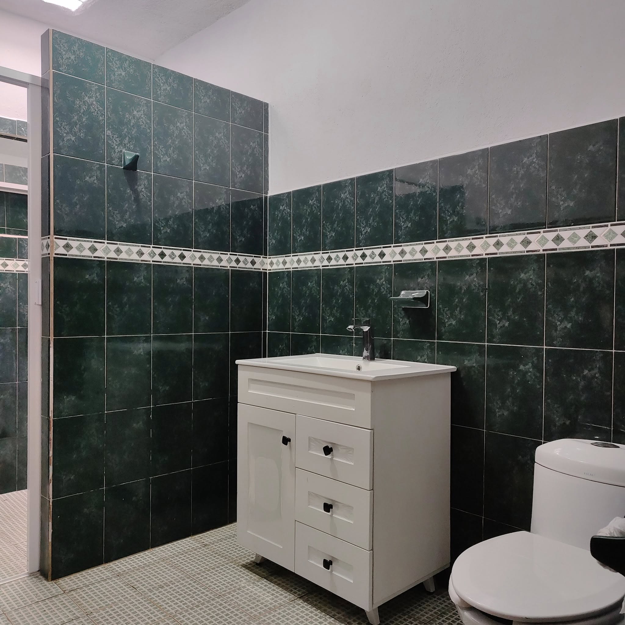 Sala-comedor, cocina grande con barra desayunador, terraza.