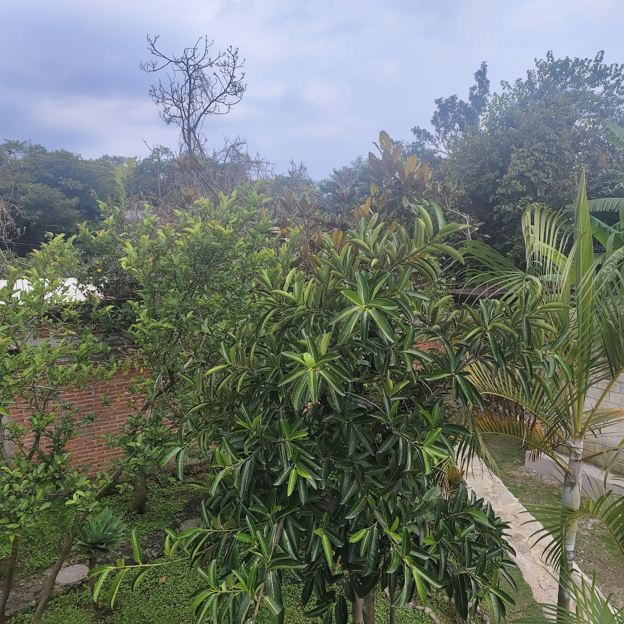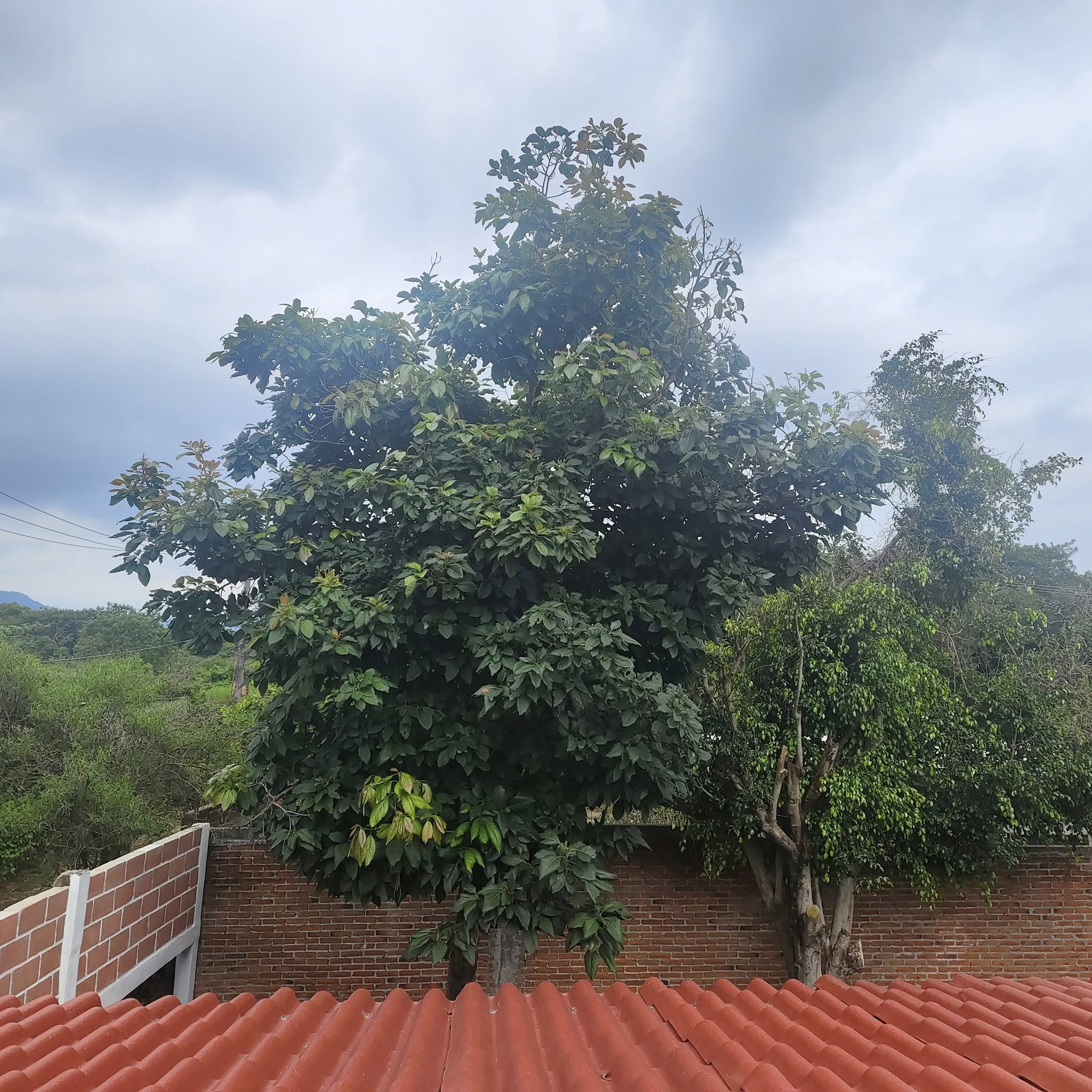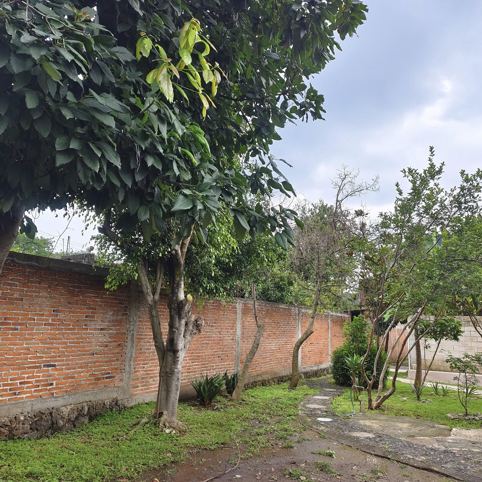 Jardín plano con árboles de guayabo, aguacate y ficus.