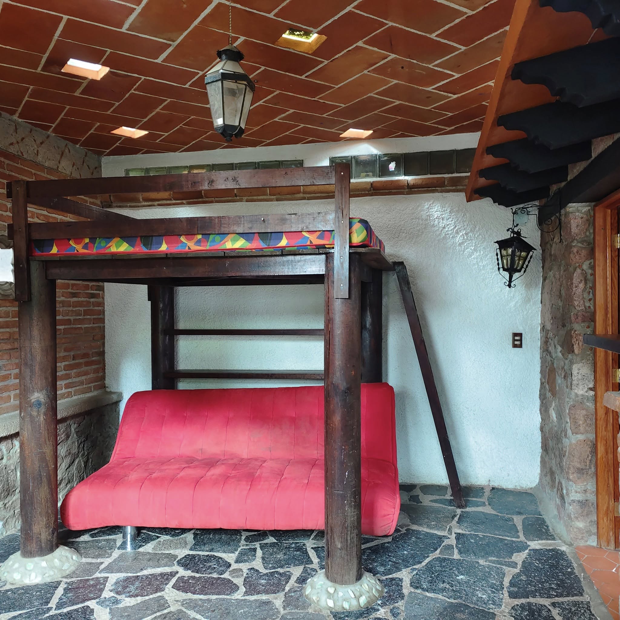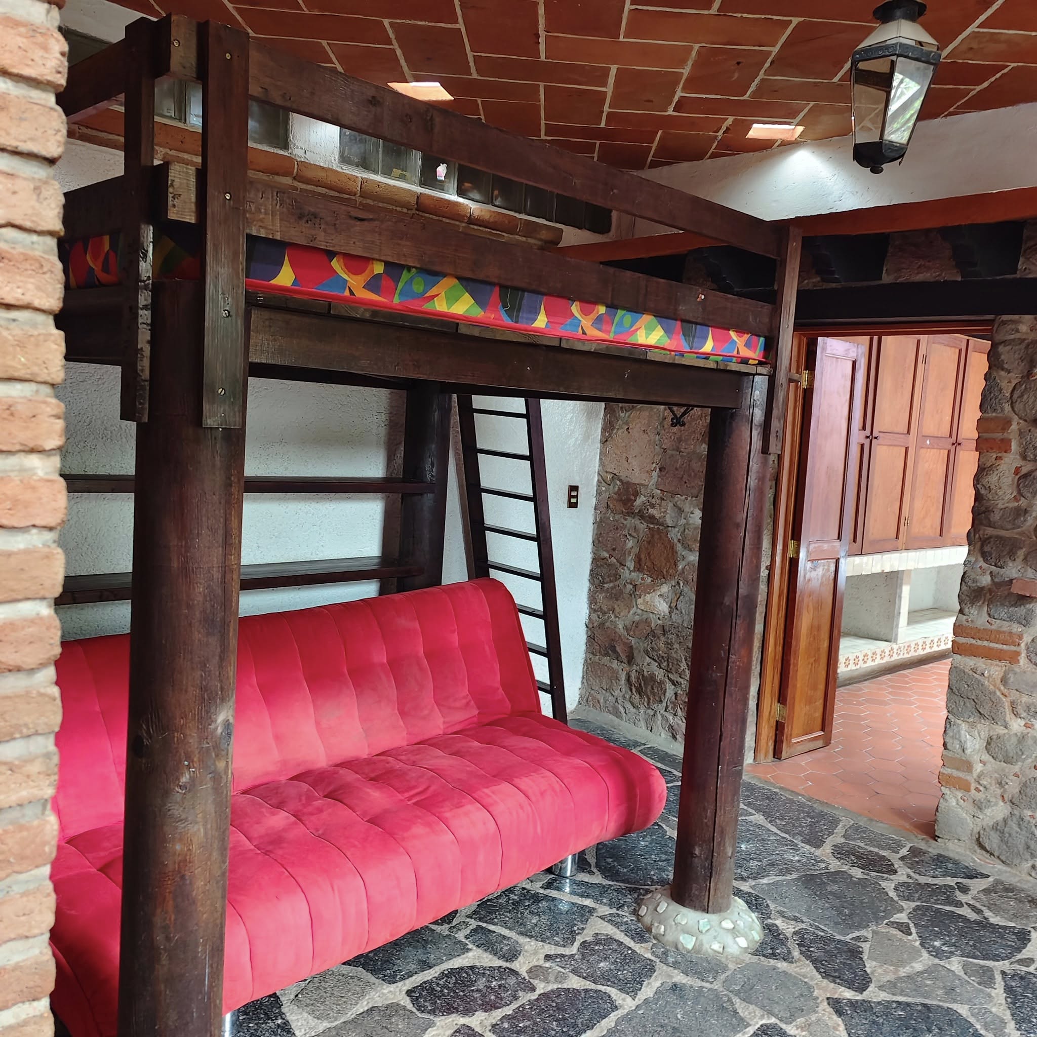 Segunda recámara con una litera tipo tapanco de madera y salida al jardín.