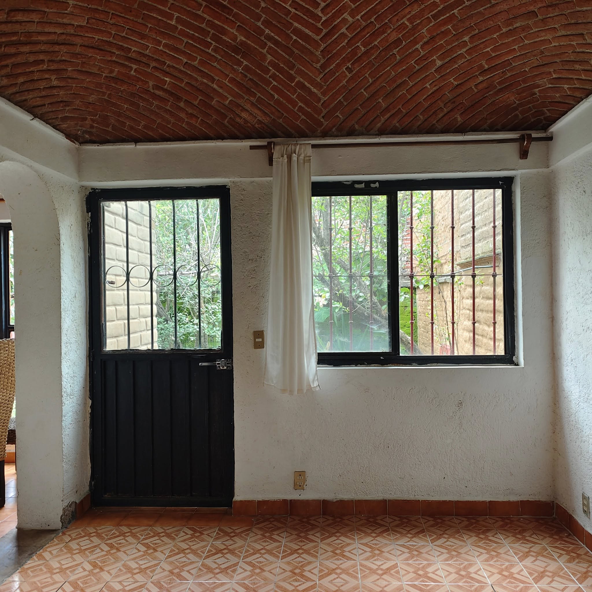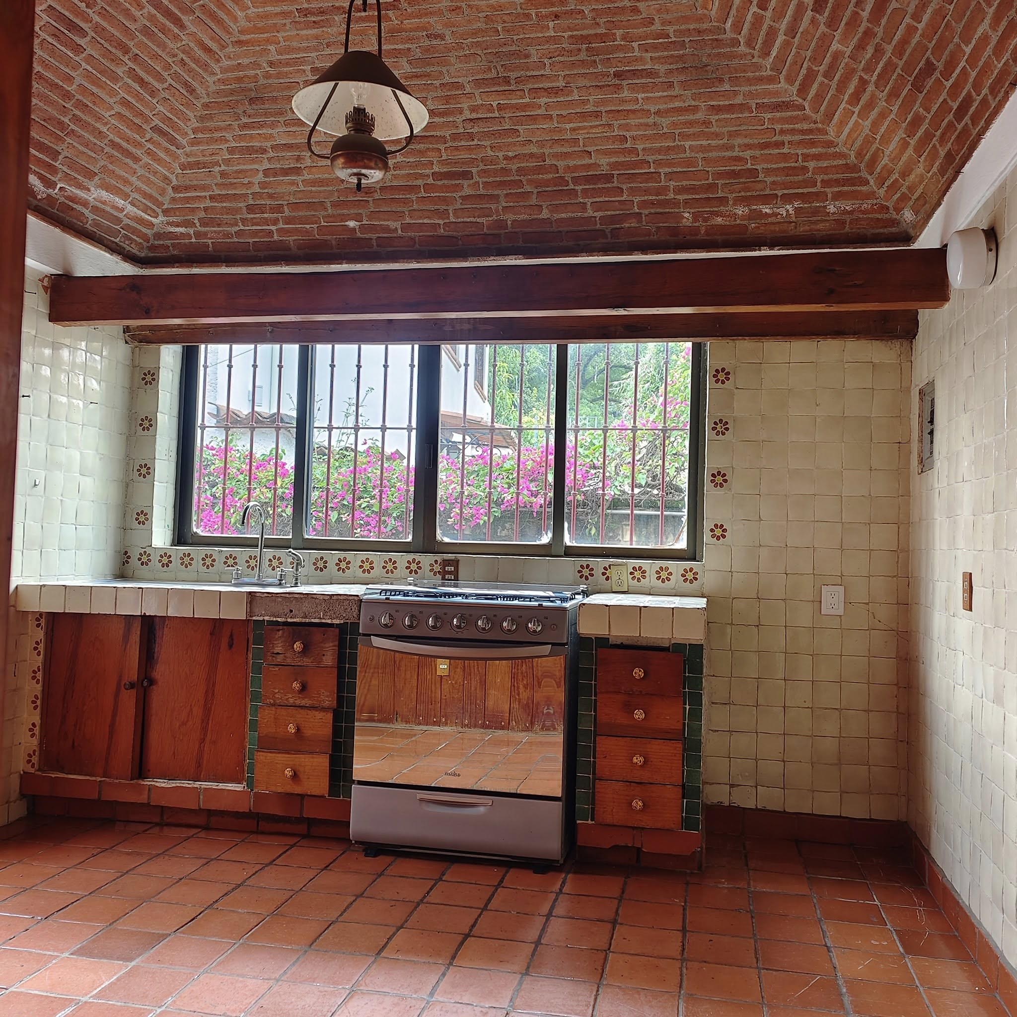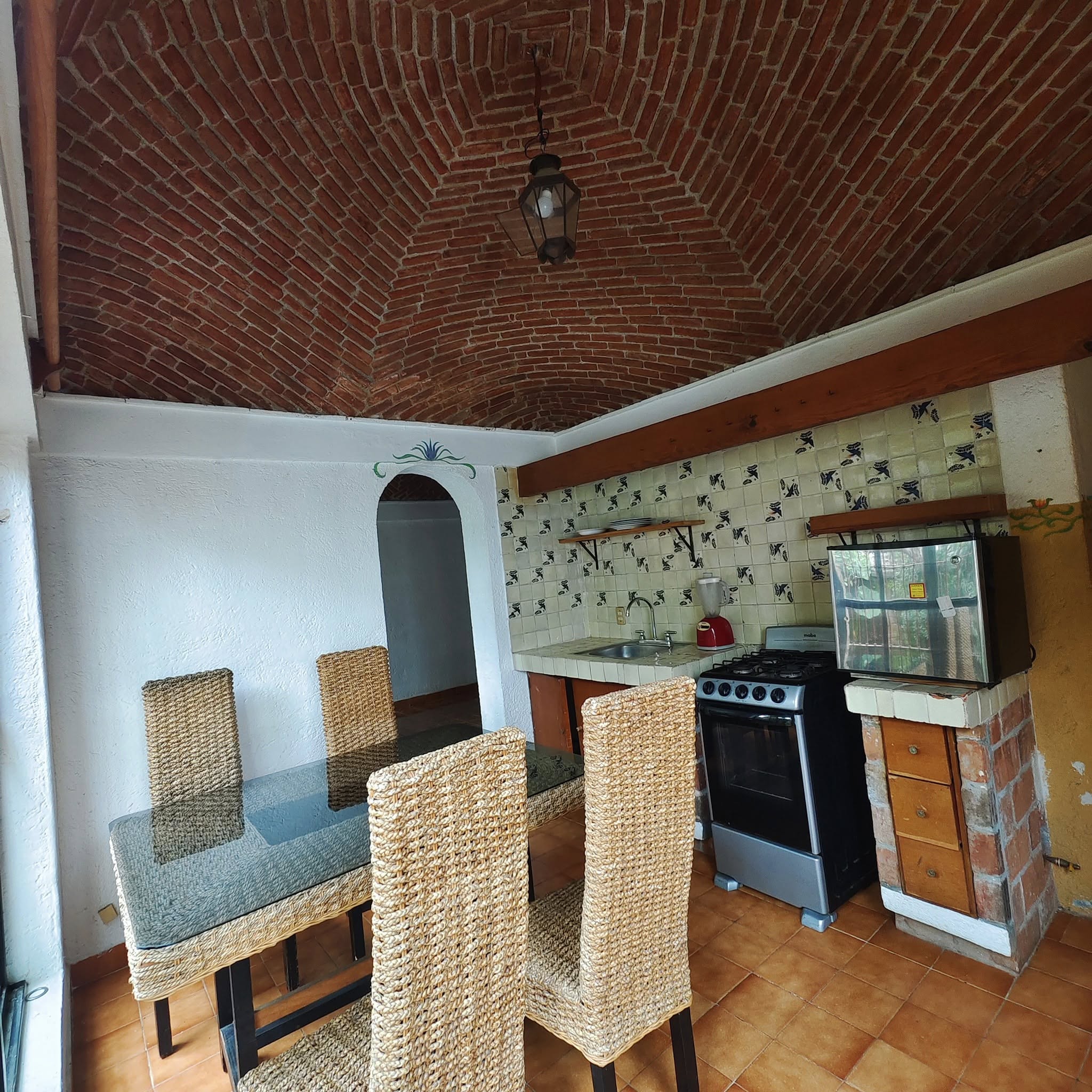 Cocina con bóveda catalana y salida al jardín.