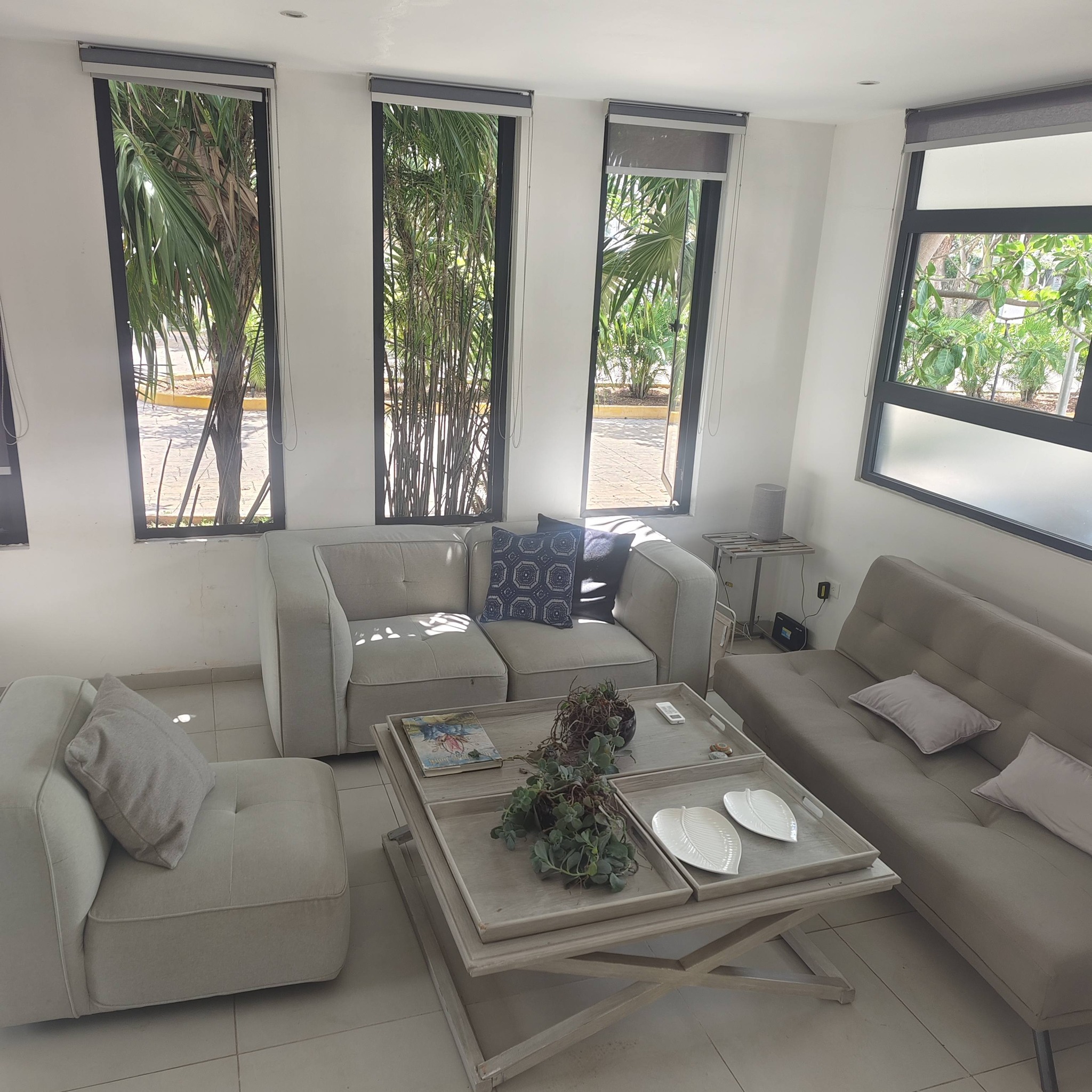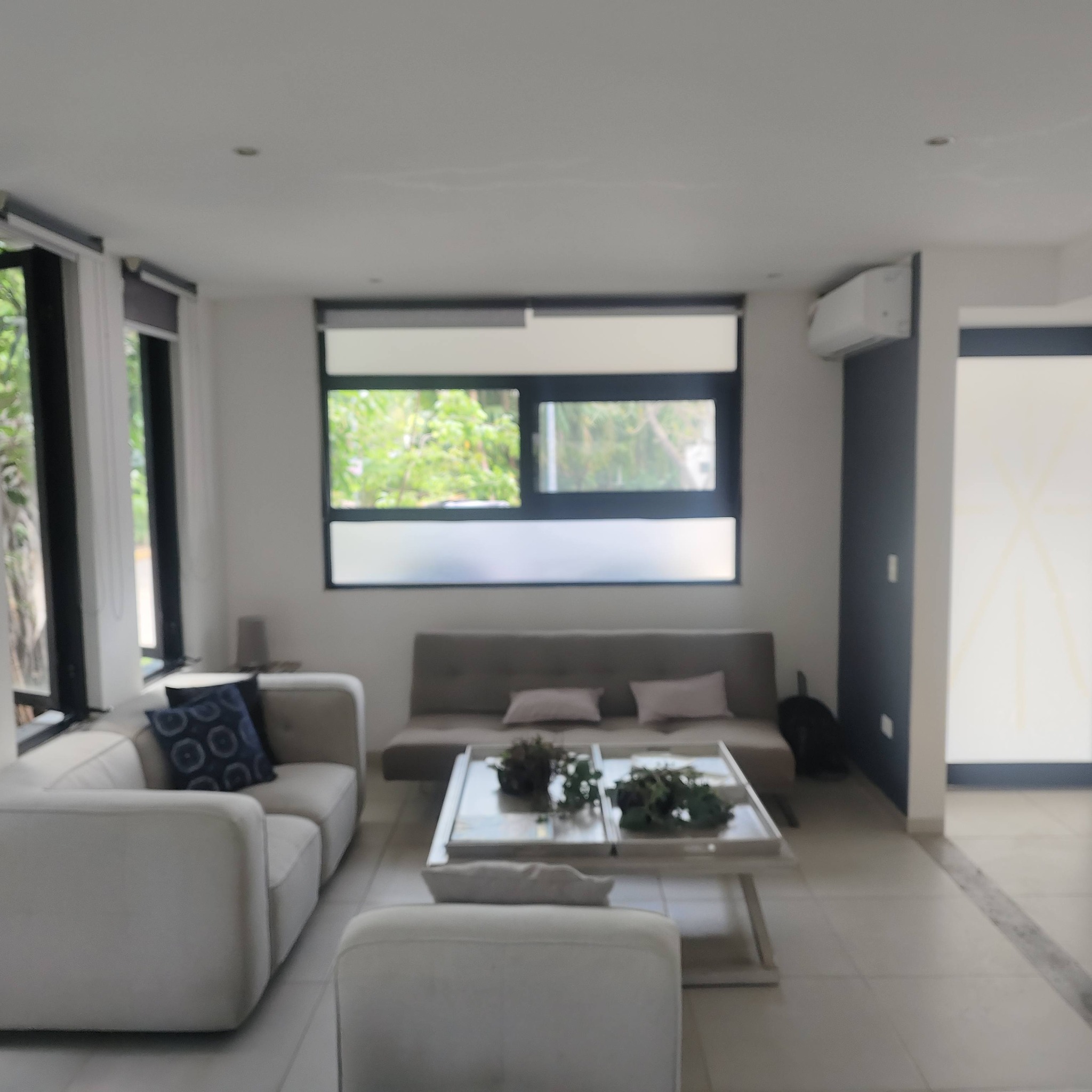 Sala, comedor para 6 personas, cocina equipada, aire acondicionado, patio trasero, área de lavado y tendido. Estacionamiento para 2 autos.