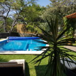 1 recámara con closet y salida al jardín, 1 y 1/2 baños, sala- comedor, cocina, área de lavado y bodega.