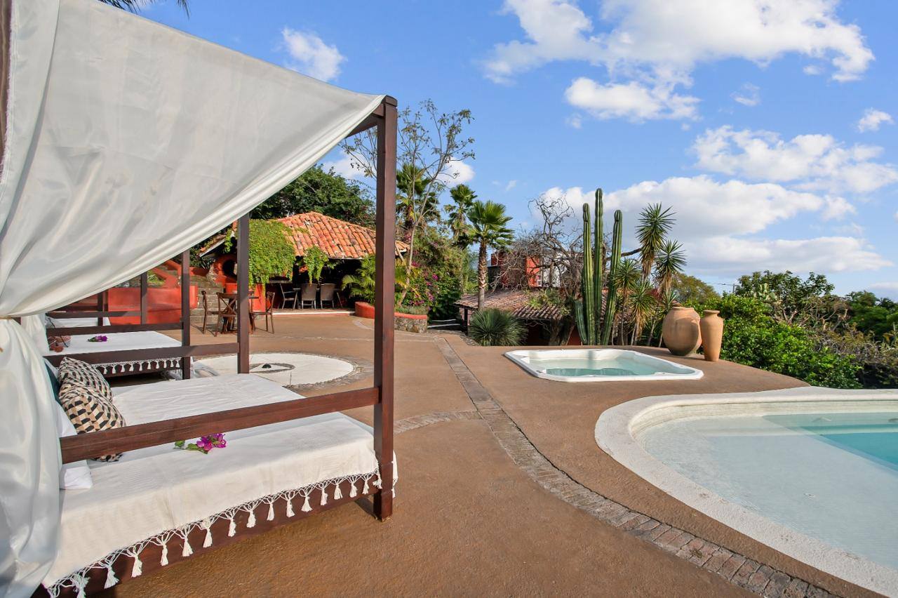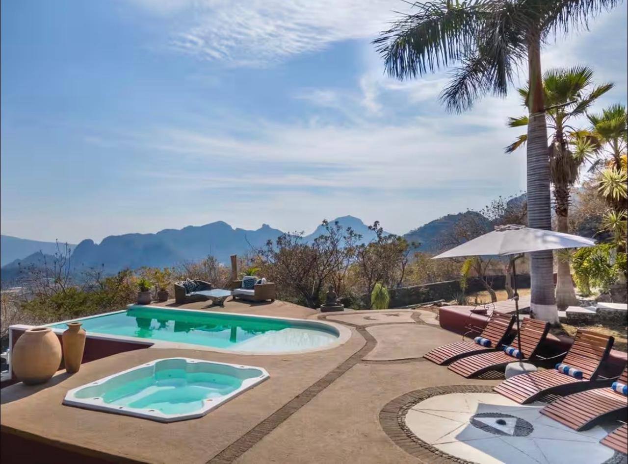 Alberca con sistema solar y jacuzzi con caldera, camastros, hamacas, muebles de jardín, terraza con comedor, asador, horno de leña, área de fogata e internet.